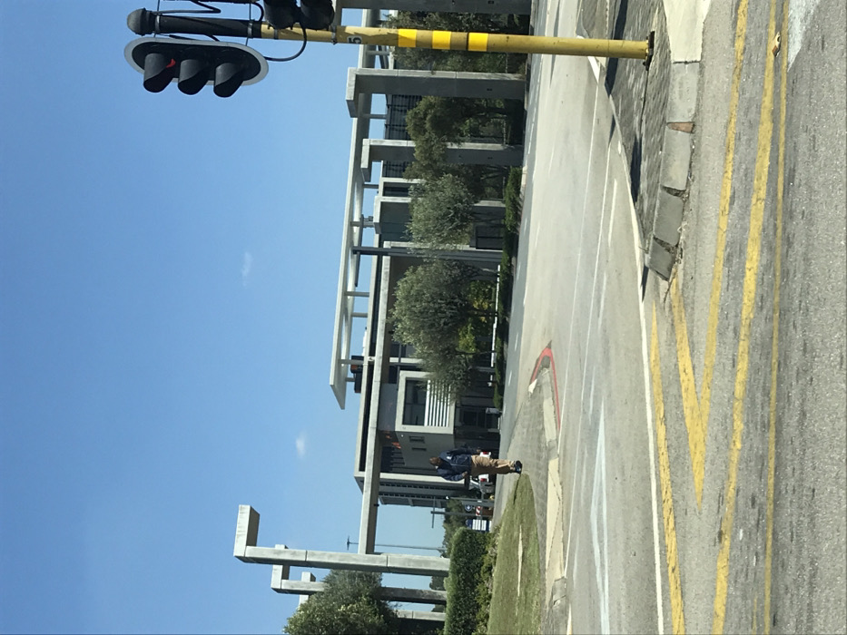 The image displays an urban scene in Sandton, South Africa, under a clear blue sky with sparse clouds, indicating bright daylight. In the foreground, an asphalt road features yellow double solid lines, yellow zigzag lines, and white dashed lane markings. A concrete curb, partially painted red and white, delineates the road edge. To the right, a yellow pole with black horizontal stripes supports a traffic light showing a red illumination. In the mid-ground, an adult male walks on a paved pathway, moving away from the viewer. He is dressed in a dark blue jacket, light brown trousers, and dark shoes. To the left of the pathway, a grassy slope is bordered by a trimmed green hedge. The background is occupied by modern, multi-story buildings constructed primarily from concrete and glass. These structures exhibit a distinctive architectural style characterized by prominent vertical pillars and large, flat, cantilevered rooflines or overhead structures. Some building sections include horizontal slatted facades. The area around the buildings is landscaped with numerous small, round-canopy trees and green shrubbery. A light-colored vehicle is partially visible in the distance, behind the pedestrian, near what appears to be a building entrance. No direct interactions are discernible.