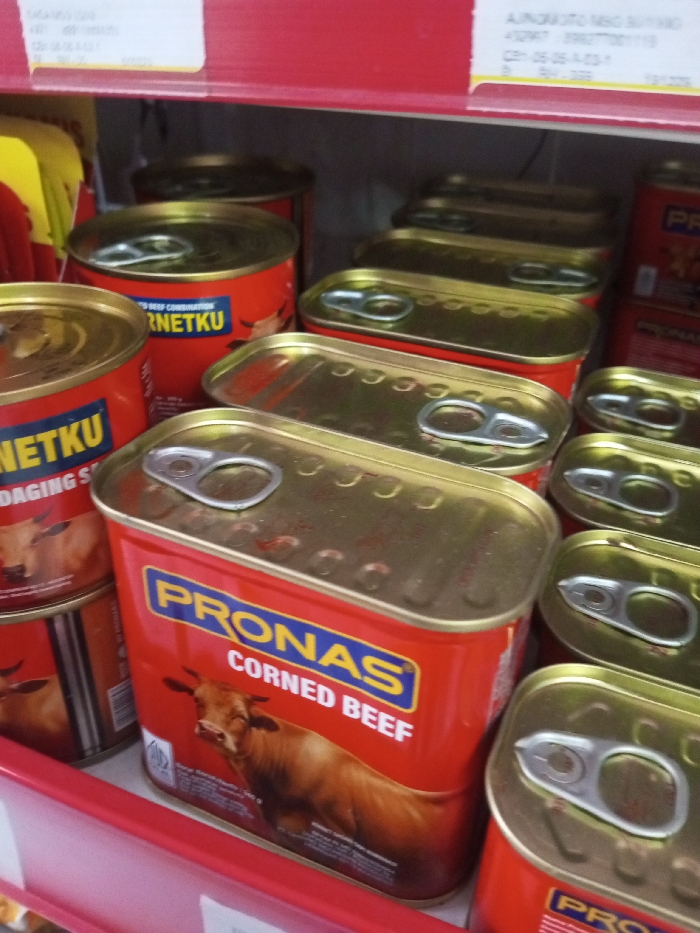 A shelf displays stacked cans of corned beef. In the foreground, red PRONAS cans with a cow image are prominent. Behind, round and rectangular cans of CORNETKU are also visible. The cans are mostly red and gold. Shelf labels are partially visible at the top, with text like "AJINOMOTO MSG" and alphanumeric codes. The shelf is red.