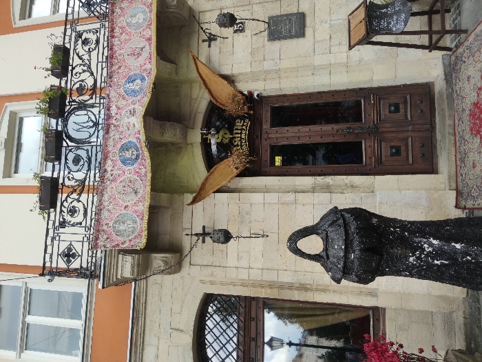 The image displays the exterior of the Masoch Cafe located at Serbska Street 7 in Lviv, Ukraine. The scene is observed during daylight. The building features a light-colored stone facade on the ground level, transitioning to an orange painted section and then a lighter upper story with white-framed windows. A wrought iron balcony with a central "M" emblem and black plant boxes containing greenery extends across the second floor. Beneath the balcony, above the cafe entrance, hangs an ornate, pink-toned tapestry or banner featuring multiple circular medallions. The main entrance consists of dark brown double wooden doors with glass panels, metal handles, and square decorative elements. Above the doors, a sign displays "Мазох-cafe" (Masoch-cafe) in Cyrillic script, flanked by large, textured, golden, wing-like or ear-shaped decorative elements. A small security camera is positioned above the right door. Two dark metal hanging lanterns or decorative objects are suspended by chains on either side of the entrance. A small dark metal plaque is affixed to the stone wall to the right of the doors. To the left of the entrance, an arched window reflects a street scene, including an antique-style lamppost. Directly in front of this window stands a life-sized, dark, heavily textured statue of a hooded figure with a hollow, oval-shaped cutout where the face should be. The statue appears to be made of a rough, dark material with lighter patches. On the sidewalk in front of the doors, a patterned rug with red and beige tones is laid out. To the far right, a wooden A-frame stand with a dark information board is partially visible. Red flowering plants are situated in a planter on the far left of the frame. No individuals are directly visible within the frame, although reflections in the doors and window suggest the presence of surrounding city life.