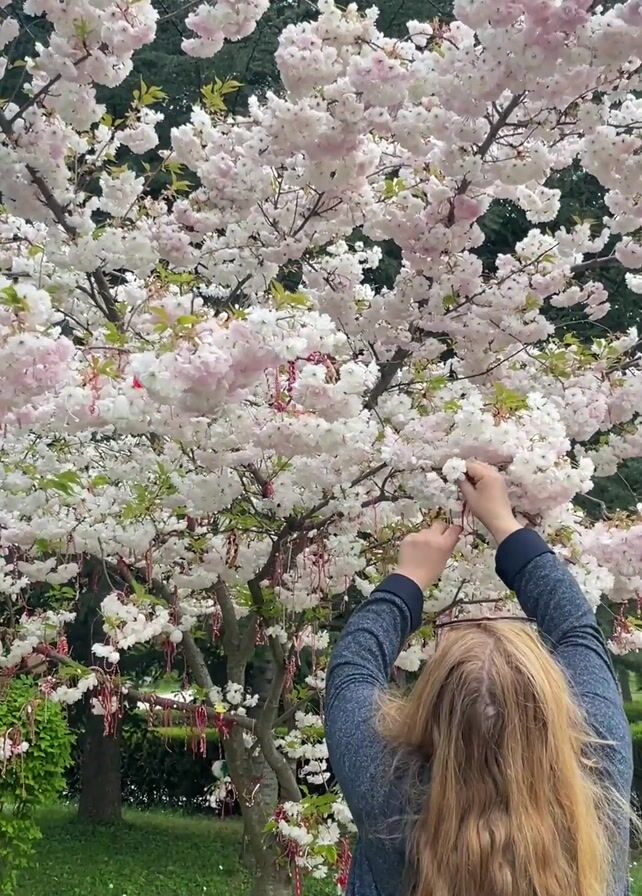 A woman with long blond hair stands in front of a blooming tree covered in white and pink flowers. She is wearing a blue cardigan. She reaches up to the tree, apparently tying a small red and white decoration to the branches. The tree is in a grassy park-like setting, with other trees visible in the background. The sky is partly cloudy.