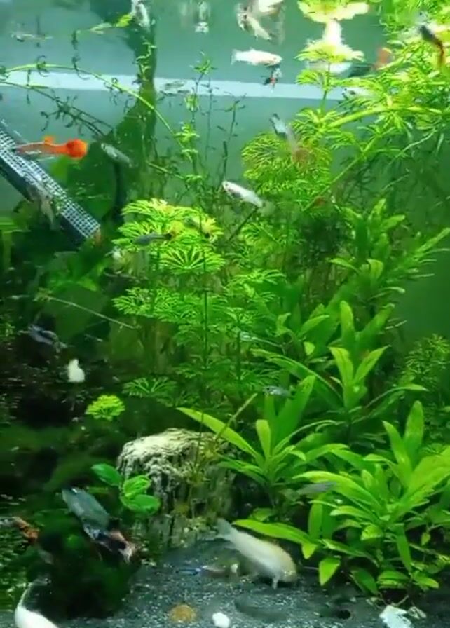 The video displays an aquarium. Inside the aquarium, there is a variety of small fish, mostly guppies, swimming among lush green aquatic plants. The tank is filled with clear water, and the bottom is covered with dark gravel. A small rock is visible in the center of the aquarium. A filter is attached to the side of the glass. The tank is lit from above.