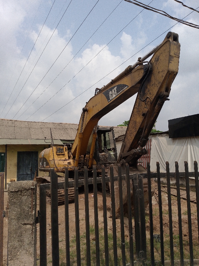 A yellow Caterpillar (CAT) 320C excavator is stationary on a dirt plot in Ijaiye, Nigeria, positioned behind a dark metal picket fence