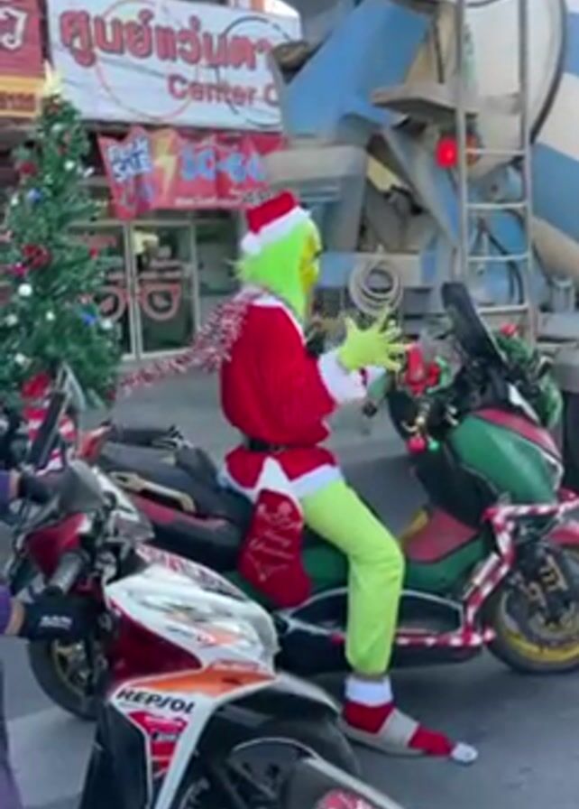 The video captures a person dressed as the Grinch in a Santa Claus outfit, sitting on a green and red scooter. The Grinch is wearing a Santa hat, a red coat with white trim and a black belt, lime green pants, and red and white striped socks with green hands. The scooter he's on is decorated with Christmas garland and ornaments. Parked next to him is a white and orange Honda scooter. In the background, there's a cement mixer truck and a store with a Christmas tree and a sales sign in Thai.