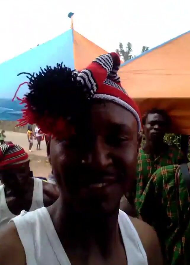 A man wearing a white tank top and a traditional knit hat with a black and red tassel is taking a selfie video outdoors. Behind him, several people are gathered under a tent, some wearing green plaid shirts. One person is playing a small drum. The sky is overcast, and power lines are visible in the background. The man smiles at the camera.