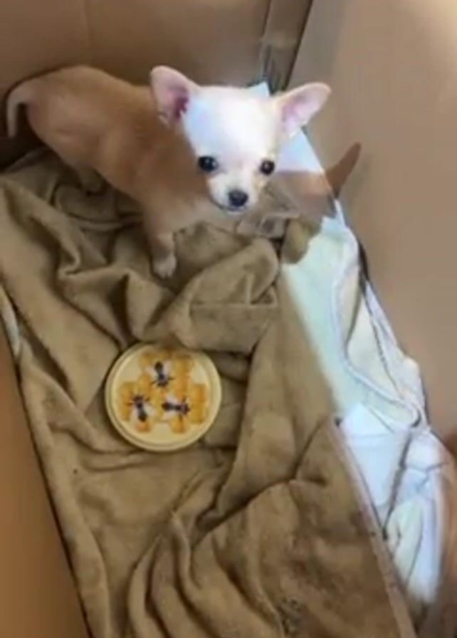 A beige and white Chihuahua puppy stands on a rumpled tan towel inside of a cardboard box. Next to the puppy, on the towel, sits a round, yellow container lid with three bees painted on it. The box is illuminated by a light source above and to the left. The puppy stares directly at the camera. Someone is speaking in the background.