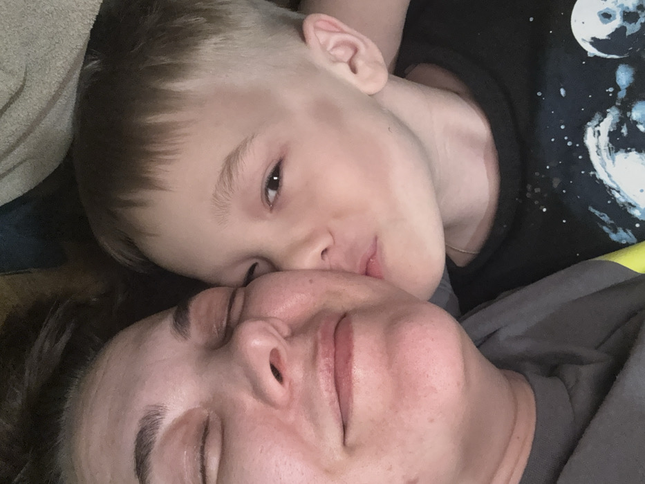 The image displays a close-up portrait featuring an adult female and a young male child. The adult female occupies the left portion of the frame, presented in profile with her eyes closed and a subtle smile. She has dark hair partially visible and is wearing a grey garment. The young male child is positioned on the right, facing towards the adult, with his lips puckered and pressed against her cheek, indicating a kiss. The child has light brown hair with a short cut, and his eyes are open, looking towards the viewer. He wears a dark t-shirt adorned with a blue and white space-themed graphic depicting planets and stars, and a thin silver-colored chain is visible around his neck. The background is softly blurred, showing dark and light neutral tones, suggestive of an indoor environment, possibly textiles like bedding or upholstery. There are no discernible features in the image to indicate a specific city or country.