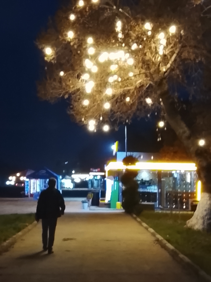 This nighttime image depicts an outdoor commercial area in Sabir Rakhimov, Uzbekistan. A single male individual, viewed from behind, walks away from the viewer on a paved pathway extending into the midground. He wears a dark jacket and dark trousers. To the right of the pathway, a large tree with a partially whitewashed lower trunk is extensively decorated with numerous round, yellow-white string lights, illuminating its branches against the dark sky. To the left of the pathway, a brightly lit commercial structure, possibly a shop or kiosk, is visible, outlined by prominent yellow strip lighting along its roofline and windows. Adjacent to this structure, to its left, are green and yellow dispensing units, potentially fuel pumps. Further into the midground and to the left, several smaller commercial stalls or tents, including one with a blue canopy, are illuminated by various artificial lights. A narrow strip of green grass separates the paved pathway from the tree and the commercial structures. Distant vehicle lights are faintly discernible in the far background.