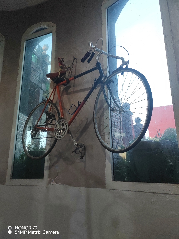 - "A vintage bicycle, predominantly orange and black, is mounted on a wall between two arched windows" by FM-z9Q8u2, licensed under CC BY 4.0