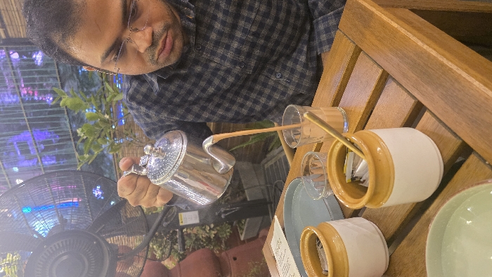 - "A man wearing glasses and a blue plaid shirt is captured in a mid-shot, actively pouring a stream of light brown chai from a silver metal teapot into a clear drinking glass" by FM-70rZN2, licensed under CC BY 4.0