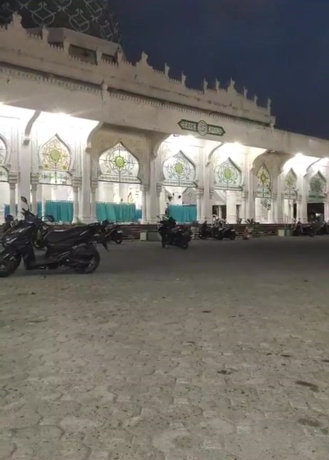 exterior of a large, white mosque at dusk. The mosque features a green and white tiled dome and a series of arched entrances adorned with intricate designs. Several parked motorbikes are visible in the open paved area in front of the mosque. One individual is seen riding a motorbike near the building. The sky is dark, suggesting it is early evening or late night. The area is illuminated by the mosque's lights, casting a glow on the surroundings.