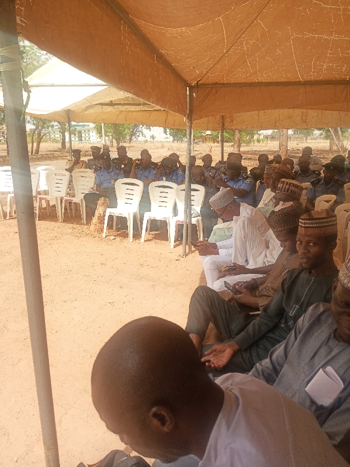 group of men sitting on white plastic chairs under a white canvas tent. The chairs are arranged in rows facing forward, with a few men seated in the front row and others sitting in the rows behind them. Most men are wearing traditional Muslim attire, including white robes and caps, but some are wearing blue uniforms with a badge. The men appear to be engaging in casual conversation and looking around. In the background, there are several other men standing. The scene is set in a large, open-air space that appears to be covered in brown sand. There is a row of buildings visible through the trees in the distance. The coordinates provided place the scene in Gwadan Gaji, Nigeria. It is a very bright sunny day with no clouds in the sky. The image is captured from a low angle looking up at the men sitting in the chairs under the tent.