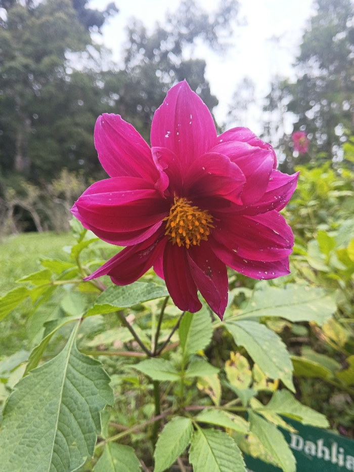 A vibrant pink dahlia with a yellow center stands prominently in focus. Dewdrops or small white specks are visible on the petals. The flower is surrounded by lush green foliage with textured leaves. A blurred background reveals a mix of trees and greenery, hinting at a garden or natural setting. A sign with "Dahlia" partially visible in the bottom right corner confirms the flower's identity.