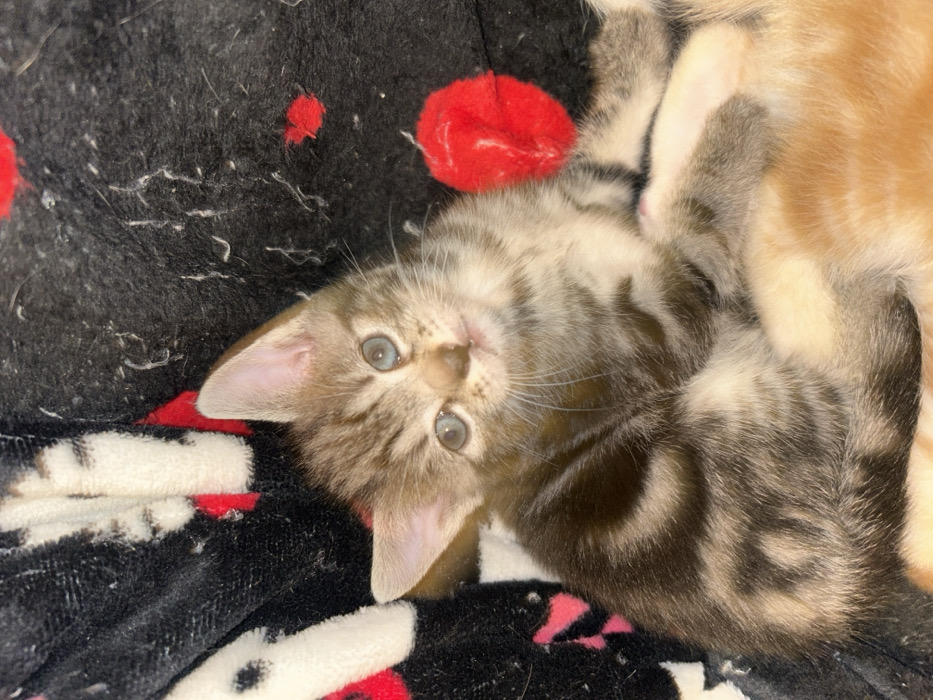A small tabby kitten with grey and black markings lies on a blanket with a black, white, and red pattern. The kitten's face is tilted up, looking directly at the camera with pale blue eyes. A larger, orange cat is partially visible to the right of the kitten, its fur blending with the tabby's. The blanket is covered in white cat hair and has scattered red circular designs.