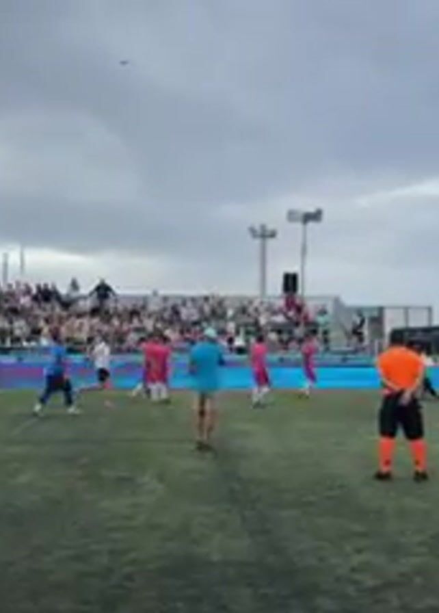 The video depicts a soccer game that has concluded. Players in pink jerseys and white jerseys are intermingling on a green artificial turf field. A referee in an orange shirt and black pants is present. A crowd is visible in bleachers. Various signs are displayed around the field. The sky is overcast. The team in pink jerseys appears to be celebrating. The team in white jerseys appears to be congratulating them.