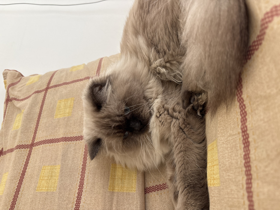 - "A long-haired domestic cat with seal point coloration, displaying a light tan body and darker brown extremities including its face mask, ears, and paws, is depicted resting indoors in Mu'adammiyat ash-Sham, Syria" by FM-tvSGy2, licensed under CC BY 4.0