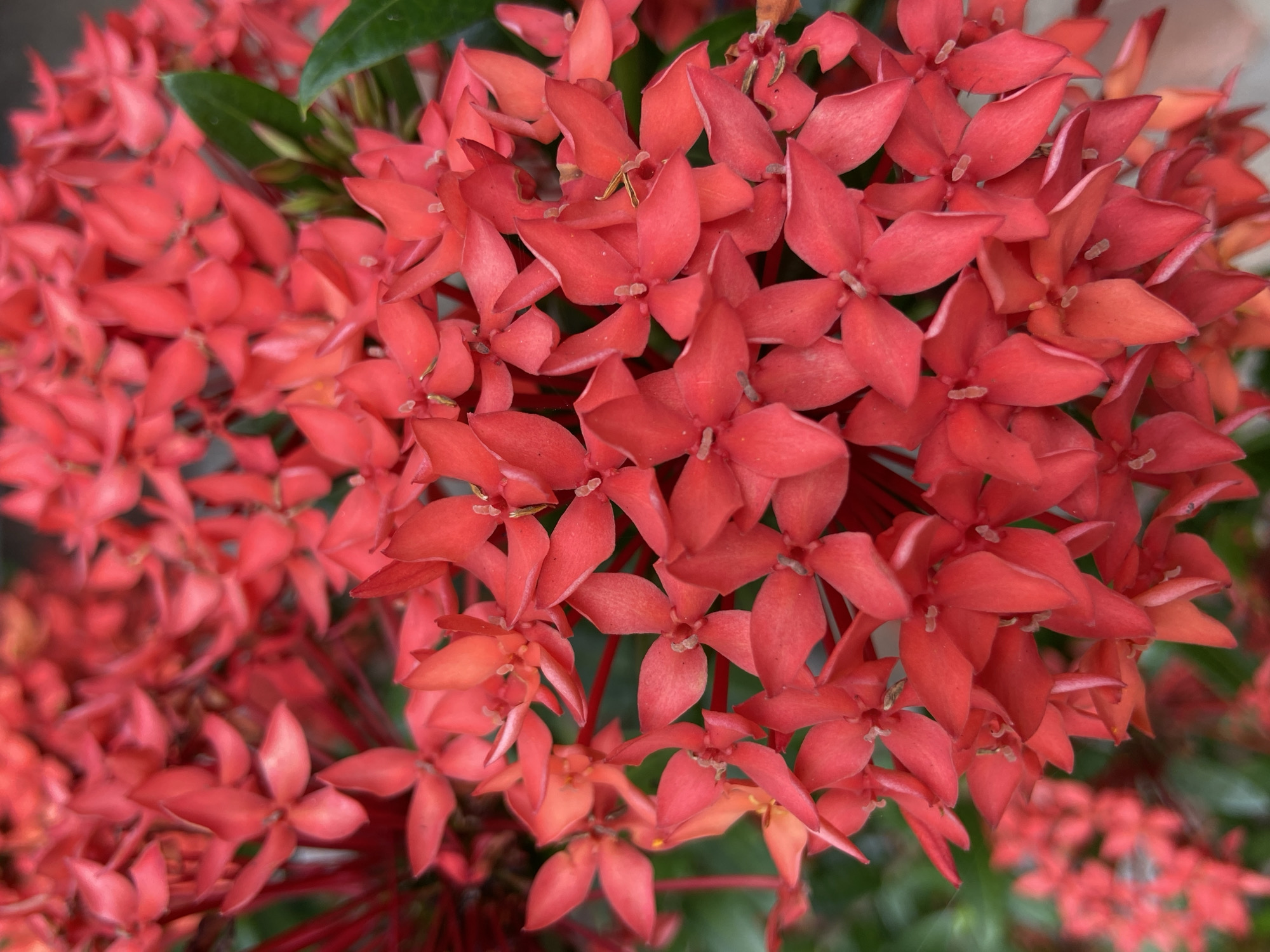 The image presents a close-up of a cluster of red Ixora flowers, also known as flame of the woods