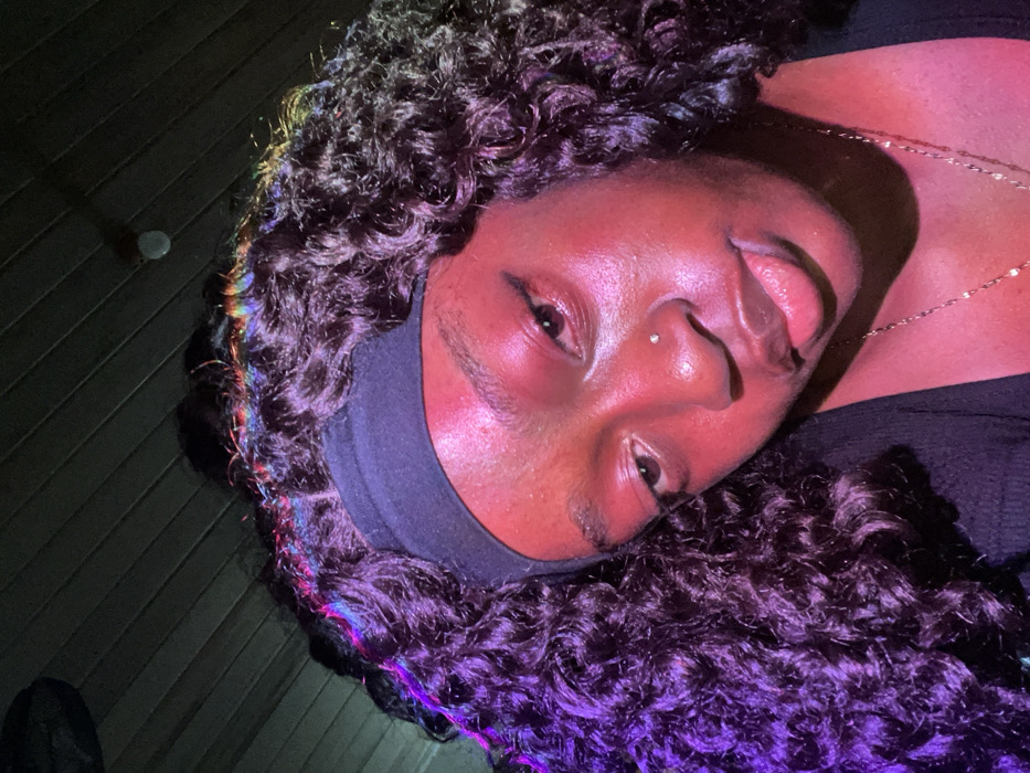 The image depicts a close-up, head-and-shoulders portrait of a dark-skinned individual, appearing female, within a dimly lit indoor setting in the city of Ado, Nigeria. The subject's face is illuminated primarily by a strong reddish-pink light, imparting a saturated hue to the skin. Dark, curly hair frames the face, partially contained by a black headband. Portions of the hair on the upper left exhibit iridescent reflections, displaying colors including purple, blue, green, and yellow. A small, silver-colored stud is present in the left nostril. Eyeliner is visible on the upper eyelids. The subject's gaze is directed downwards and to the right, away from the camera, with lips slightly parted. The individual wears a dark-colored top and a delicate gold-colored chain necklace with small, reflective links. The background, largely dark, reveals a ceiling composed of horizontal planks or panels, with a small, white-colored light fixture faintly visible in the upper right quadrant. The individual is posing for the photograph.