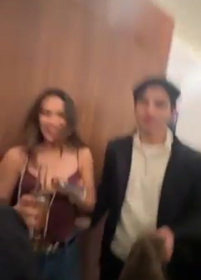 three young adults inside a room with wood paneling. The camera’s focus shifts between the individuals. A person in a black shirt passes by the camera in the foreground. Then, a young woman in a maroon top is seen holding a drink. A young man in a white collared shirt and black jacket stands next to her, looking toward the camera. They both appear to be laughing or talking excitedly.