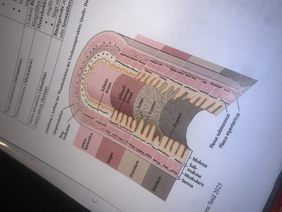 The image depicts a diagram of the layers of the digestive tract wall, labeled in German