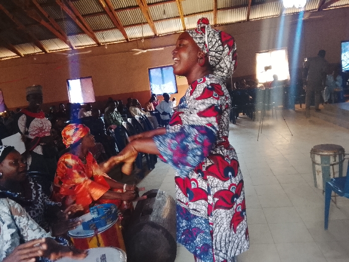The scene depicts an indoor gathering in the city of Akwanga, Nigeria