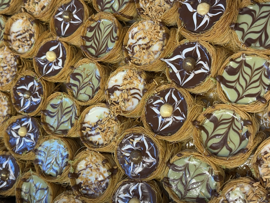- "The image presents a dense, overhead close-up view of numerous individual Middle Eastern pastries, specifically small, circular nests crafted from golden-brown, shredded phyllo dough, characteristic of kataifi or kunafa" by FM-jqiIm2, licensed under CC BY 4.0