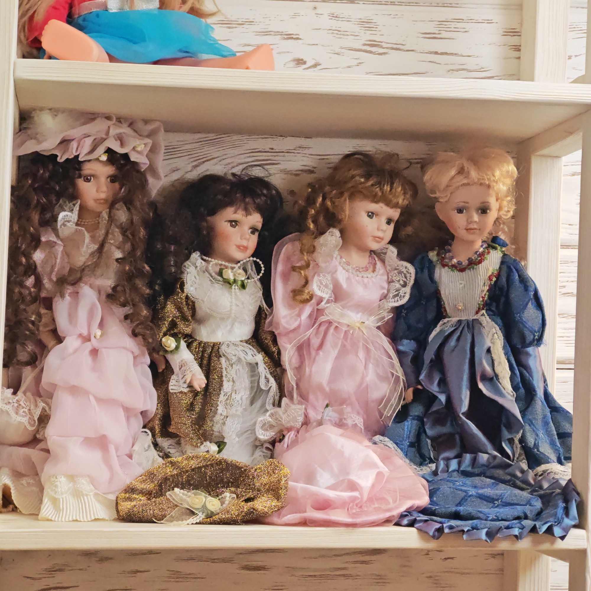 four porcelain dolls on a shelf. From left to right, the dolls wear a pink dress, a gold and white dress, a pink dress, and a blue dress. A gold hat with flowers rests in front of the second doll. Above the shelf is another shelf, with a blue dress and an object with an orange tint. The background is a white, rough wood wall. This image was taken in Rostov, Russia.