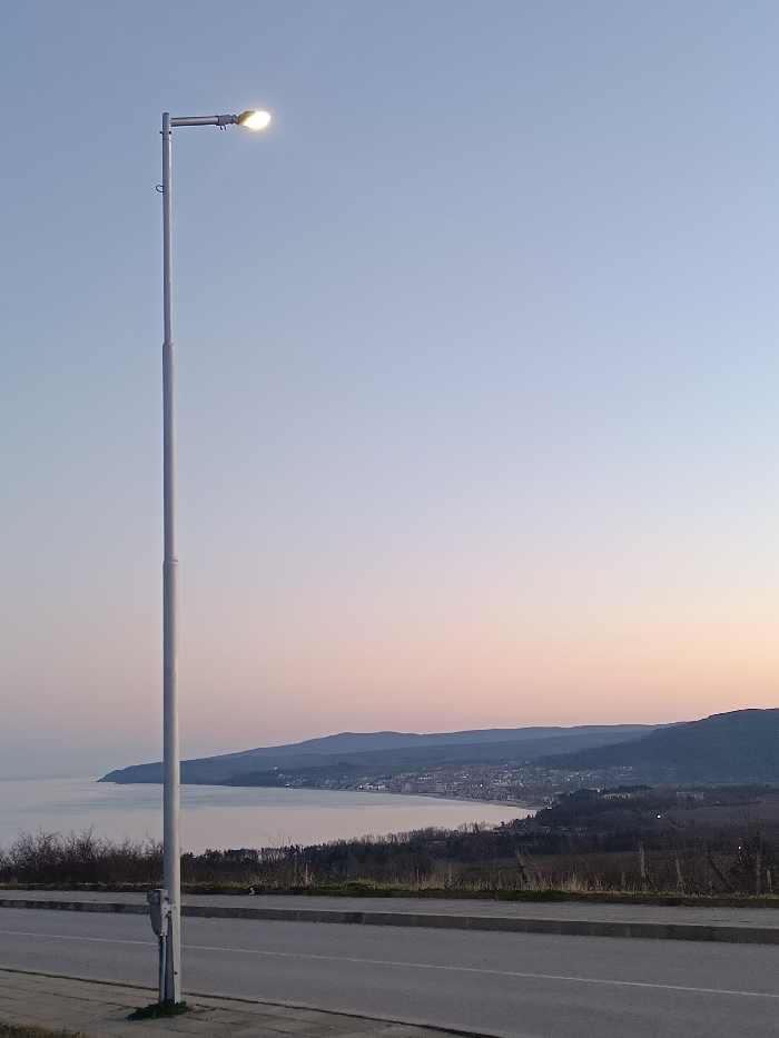 The image presents a wide view of the city of Byala, Bulgaria, at twilight, overlooking the Black Sea. A tall, gray, two-segment street lamp post stands prominently on the left side of the foreground, its fixture emitting a bright white light. Below the lamp, a paved asphalt road runs horizontally, bordered by a concrete curb. Beyond the road, a strip of sparse, dormant vegetation occupies the land leading down to the coast. The calm Black Sea occupies the midground, its surface reflecting the soft light of the twilight sky, which transitions from light blue at the zenith to pale pink and orange near the horizon. The city of Byala is visible along the curved coastline, featuring clusters of buildings extending from the shore up into the lower hills. Dark, undulating hills rise in the background behind the city and along the distant coast. There are no individuals or discernible actions present in the scene.