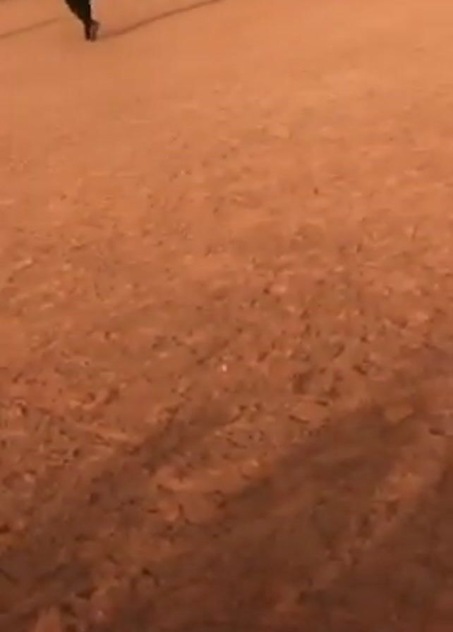 soccer practice taking place on a dirt field. There are several people dressed in athletic wear, some wearing bright yellow vests. They are spread across the field and are kicking and passing a soccer ball. A concrete wall runs along one side of the field, and there are trees in the background, including a palm tree. The sky is visible overhead.