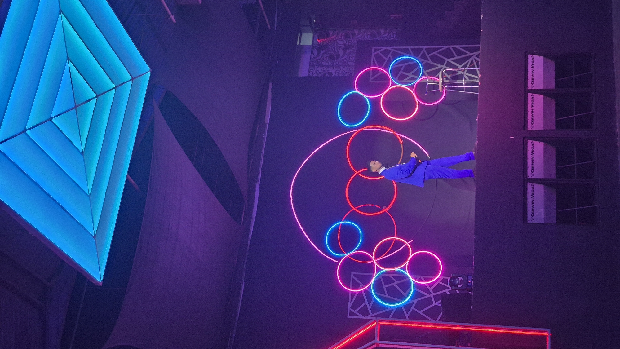 An indoor stage event in San Diego, Venezuela, features a male performer in a bright blue suit, standing center-right on a black elevated stage. He holds a microphone in his right hand. The dark background wall is adorned with an abstract arrangement of overlapping neon-style rings in pink, blue, and red, with a prominent large pink ring. To the far left, a geometric structure outlined with red neon lighting is visible. A tall, silver-legged stool with a dark seat is positioned on the right side of the stage. Below the stage, four black speaker units, each branded "CERWIN-VEGA!", are visible. Overhead, a large, multi-tiered square light fixture emits a vibrant blue light. Dark fabric drapes are present in the upper background, under purple ambient illumination.