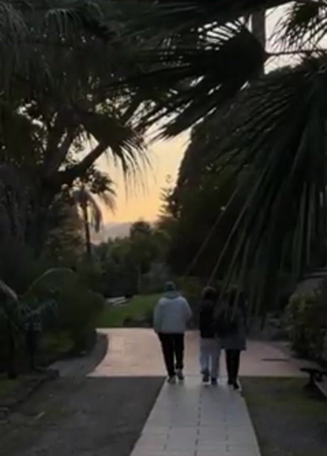 Three people walk away from the viewer on a gray brick path towards a sunset. The path is surrounded by trees and greenery. Palm trees frame the shot on both sides. The people consist of a heavier person in a light gray puffer jacket, a person in a darker gray jacket and light gray pants, and a person in a darker jacket. All three are walking at a casual pace. The sky in the background is orange and yellow. The overall impression is one of a peaceful evening stroll.