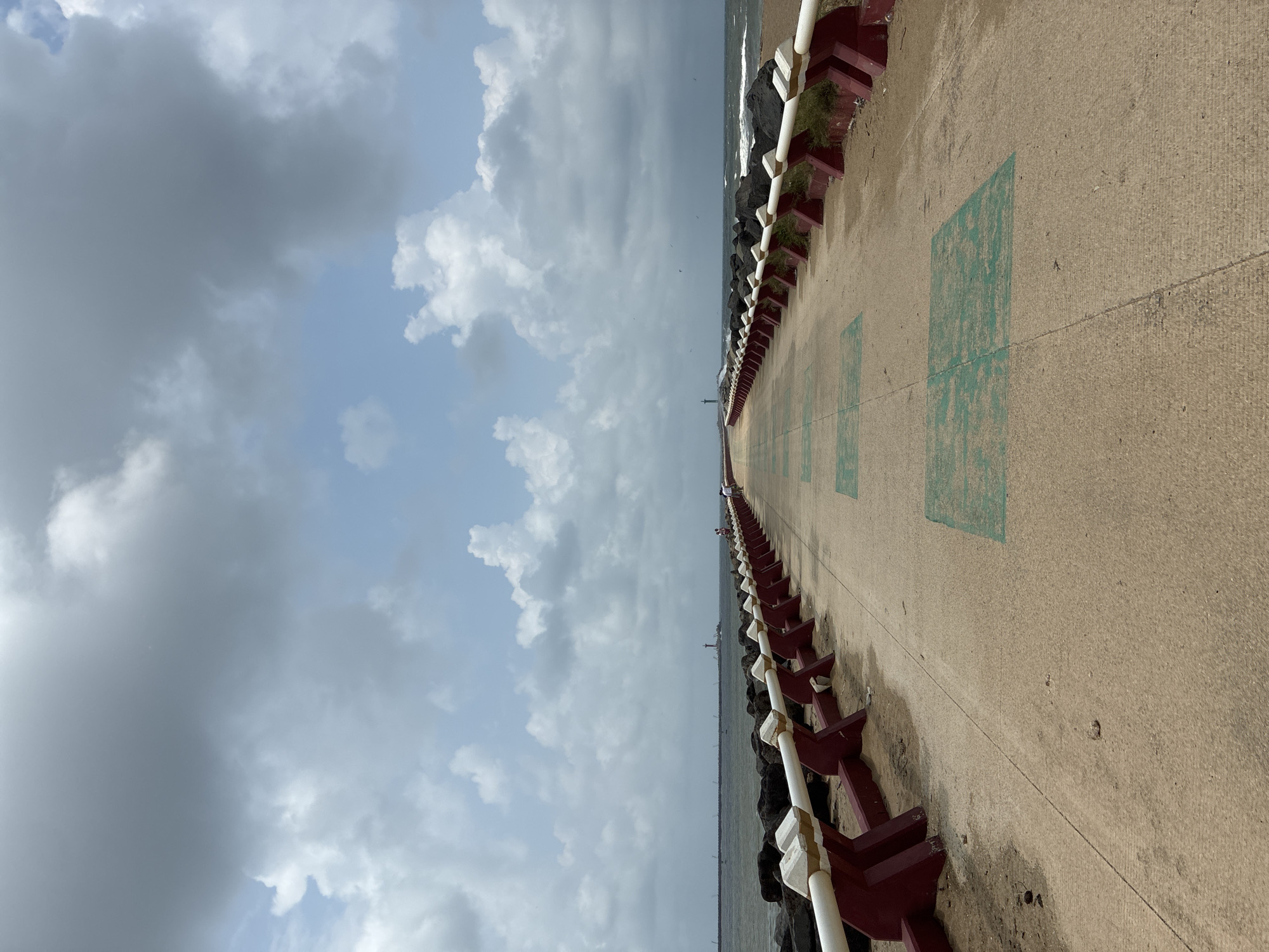 The photograph shows a long, concrete pier or walkway extending into the ocean. It appears to be located in or near the city of Allende, Mexico. The pier is bordered on both sides by a low barrier consisting of white poles supported by reddish-brown, triangular-shaped brackets, with interspersed rock formations. Some vegetation grows between the rocks and barriers. The walkway itself has a series of faded, green rectangular designs spaced along its surface. In the distance, a small structure, potentially a lighthouse, can be seen. The sky is predominantly cloudy with patches of blue. The perspective suggests the photo was taken at a low angle, looking lengthwise along the pier. There are a few indistinct human figures in the distance on the pier. The ocean is visible on both sides of the pier, with some signs of waves.