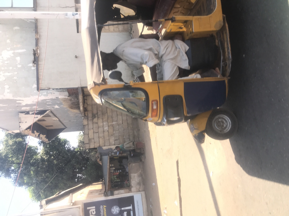 The image captures a sunlit street scene in Maiburiji, Nigeria. In the foreground, a yellow and dark blue motorized trishaw, or auto-rickshaw, travels from right to left on a paved road. An adult male, wearing a white long-sleeved garment and a white cap, operates the vehicle; his bare feet are visible. The trishaw casts a distinct shadow on the road surface to its left. In the mid-ground, to the left of the road, a partial white billboard displays text including "val" and "affordable luxury" and an image of a fan. Behind this, a small, open-fronted kiosk, constructed from light-colored concrete blocks and topped with a corrugated metal roof, offers various items for sale. One individual is seated within the kiosk, while another, a young person in light clothing, stands outside, facing it. A large, leafy green tree is visible behind the kiosk structure. Further back, a light-colored concrete block wall, topped with what appears to be barbed wire, separates the foreground elements from a two-story building. This building's facade is characterized by peeling, light-colored paint, exposing darker areas, and features an unusual diamond-shaped architectural protrusion on its upper level. Utility wires are visible across the upper portion of the frame. The scene is illuminated by strong daylight, indicating a clear, sunny environment.