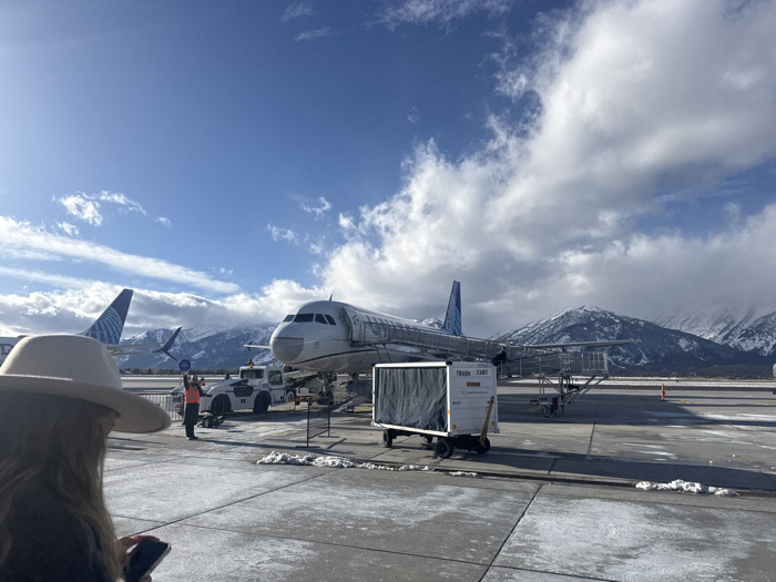 An airport scene features a white passenger airplane on the tarmac, prepped with a catering truck and service vehicles. A United Airlines plane is visible in the background, with snow-capped mountains completing the backdrop. A person in a hat holds a phone in the foreground, possibly capturing the scene. The sky is partly cloudy, suggesting a bright, possibly cold day.