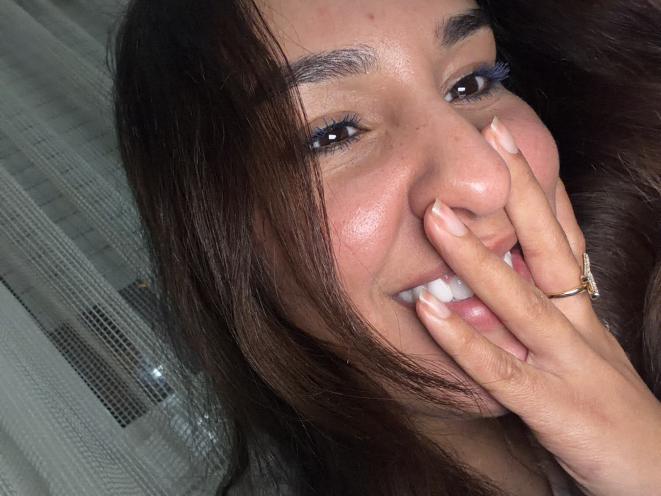 A woman with brown hair smiles, partially covering her mouth with her hand, revealing a glimpse of her teeth. She has brown eyes enhanced with vibrant blue mascara. Her skin appears radiant and healthy, reflecting light on her cheekbones. A gold ring adorns her ring finger. A textured white curtain hangs in the background, adding a soft element to the image.