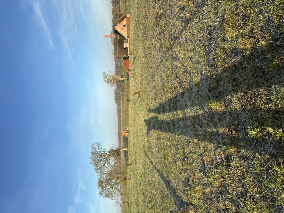 The image displays a rural landscape in East Suffolk, United Kingdom, under a clear blue sky with minimal cloud cover. The foreground consists of a frost-covered grass field, upon which two distinct, elongated human shadows are cast, indicating a low sun angle from behind the viewer. Scattered across the mid-ground are several bare deciduous trees and young saplings, some supported by stakes. To the right mid-ground, a red-brick house with a traditional thatched roof and a prominent brick chimney stands, accompanied by a smaller red outbuilding to its left. A partially ruined brick structure is visible to the left in the mid-ground. The background features a distant horizon line marked by a strip of mature trees. No direct human figures, actions, or interactions are visible, only their shadows.