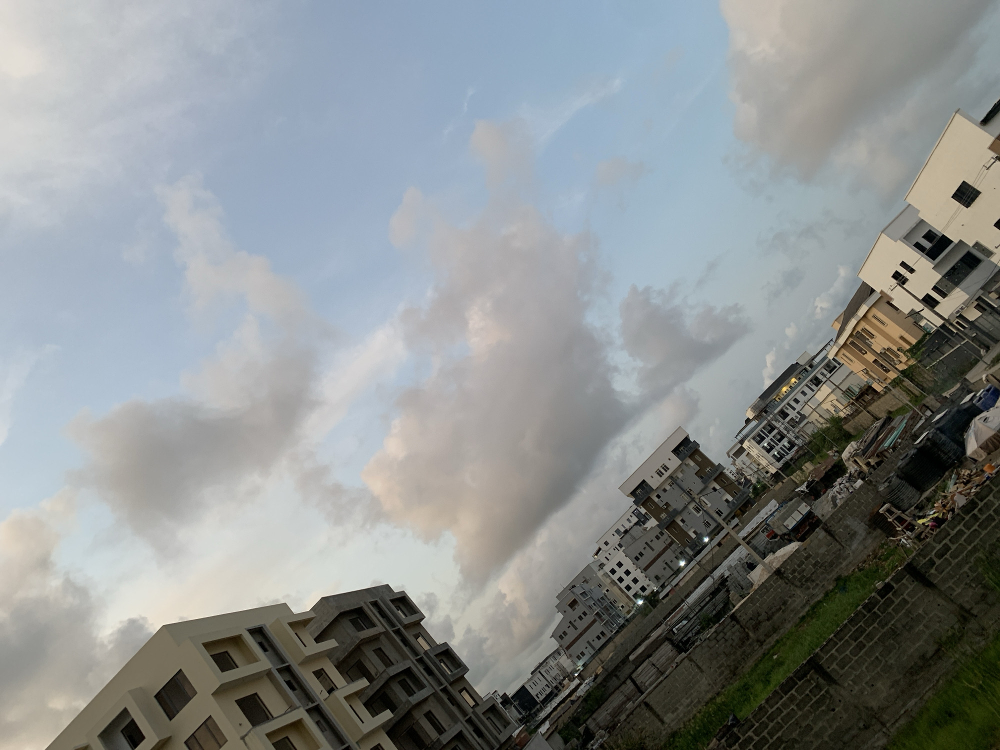 This image depicts an urban landscape in Moba, Nigeria, captured from an elevated, oblique perspective. The sky occupies the upper portion, featuring a light blue hue with numerous white and grey stratocumulus clouds. In the upper-left quadrant, a multi-story building, either under construction or renovation, presents a light-toned (cream/beige) facade with square window cutouts and recessed balcony structures. Its lower sections reveal exposed grey concrete. Across the mid-ground, a series of modern, multi-story buildings are visible, characterized by white and grey facades with dark-framed windows and balconies. The lower third of the image foregrounds a diagonal wall constructed from grey concrete blocks, enclosing a section of sparse green grass. Beyond this wall, an accumulation of assorted debris, waste materials, and what appear to be rudimentary shelters with corrugated metal roofs are present. No individuals are visible within the frame. The scene is illuminated by natural light, consistent with daytime conditions.