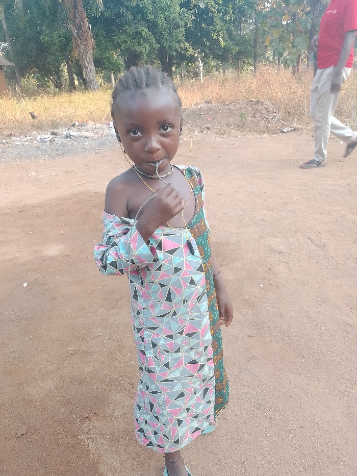 A young girl with braided hair stands outdoors, wearing a colorful patterned dress. She holds a thin object, possibly a reed or twig, in her mouth. She has earrings and a necklace. A person in a red shirt and light pants walks in the background. The surrounding environment is a dry, dusty area with sparse vegetation and trees.