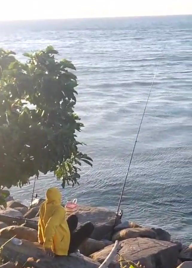 The video begins with a static shot of a person wearing a yellow hooded jacket sitting on rocks next to a fishing rod. The person has their back to the camera and appears to be looking out at the water. The camera then pans up and to the right, revealing a wide view of the ocean. In the distance, a large marine mammal, possibly a whale or dolphin, is visible. The camera follows the animal as it moves through the water. Other individuals are present in the background, walking around the rocks. The environment appears to be a coastal area with trees and rocks. The lighting suggests it is either sunrise or sunset. The audio contains music.