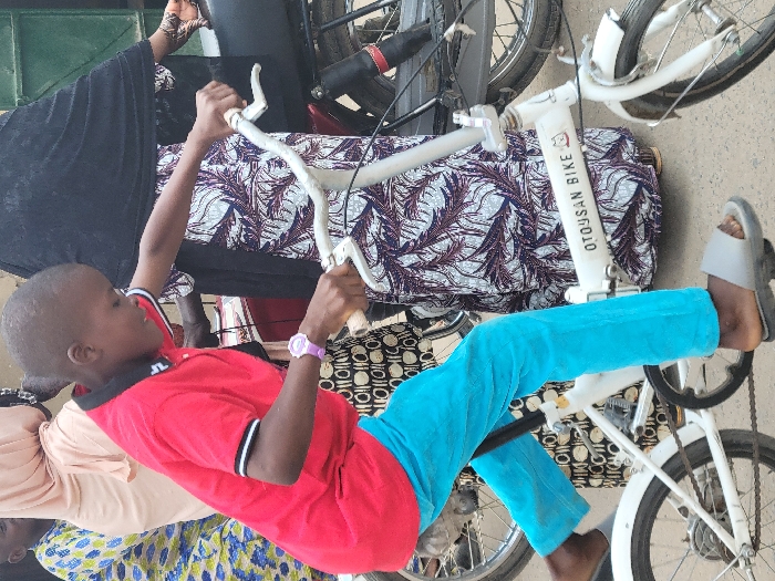 - "A young male child is depicted riding a white 'OTOUYAN BIKE' folding bicycle on a light-colored, possibly unpaved, street in Suleja, Nigeria" by FM-tQkEt2, licensed under CC BY 4.0