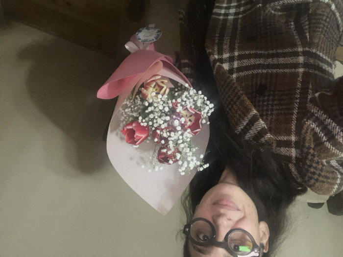 - "A woman wearing round glasses and a brown plaid jacket holds a bouquet of red and cream tulips interspersed with baby's breath" by FM-l44z72, licensed under CC BY 4.0