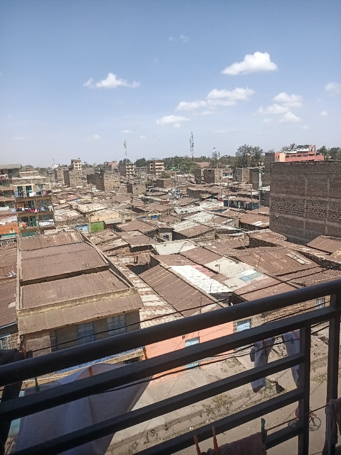 This image presents an elevated, wide-angle view of a densely packed urban residential area in the city of Unknown, Unknown, under a clear, bright sky with scattered white clouds. The scene is dominated by a vast expanse of low-rise structures, primarily exhibiting corrugated metal roofs that vary in color from rusted browns to dull grays, indicating age and exposure. In the immediate foreground, a dark metal balcony or rooftop railing is visible, with articles of light-colored clothing secured by clothespins hanging to dry. Below the railing, on what appears to be a narrow, unpaved street or pathway, two individuals are partially visible from the lower torso down, wearing light-colored trousers or garments. Their specific actions or interactions are not discernible. The mid-ground and background feature a multitude of closely built structures, constructed from materials consistent with brick or concrete blocks. Some buildings appear to be multi-story, with laundry visible on balconies or hanging from windows on the upper floors of structures to the far left. Overhead utility lines crisscross between many of the buildings. In the distant background, taller, more defined buildings and several communication towers or masts rise above the dense residential area. Sparse trees are interspersed throughout the urban landscape. The overall environment suggests an informal or working-class settlement characterized by high building density and visible signs of daily life.