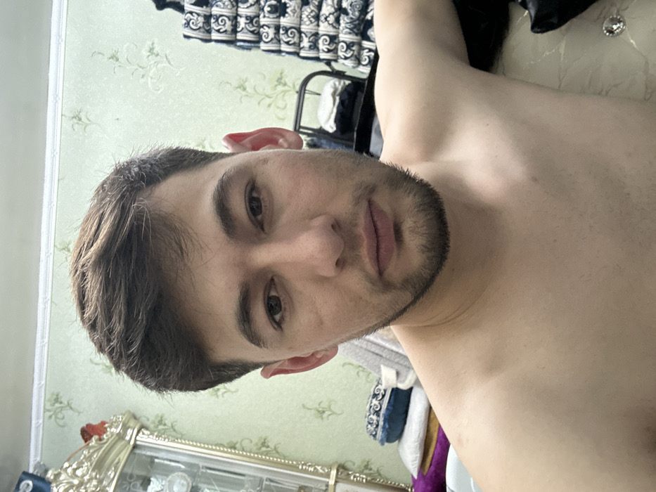 A shirtless man lies on a bed, facing the camera. He has brown hair and a trimmed beard. The background features patterned wallpaper and a bed with pillows and a black garment. A silver-framed object sits near the bottom of the frame, possibly a mirror or artwork. The man's skin tone appears fair. The composition is an eye-level shot with the image rotated, placing the man's head near the left edge of the frame.