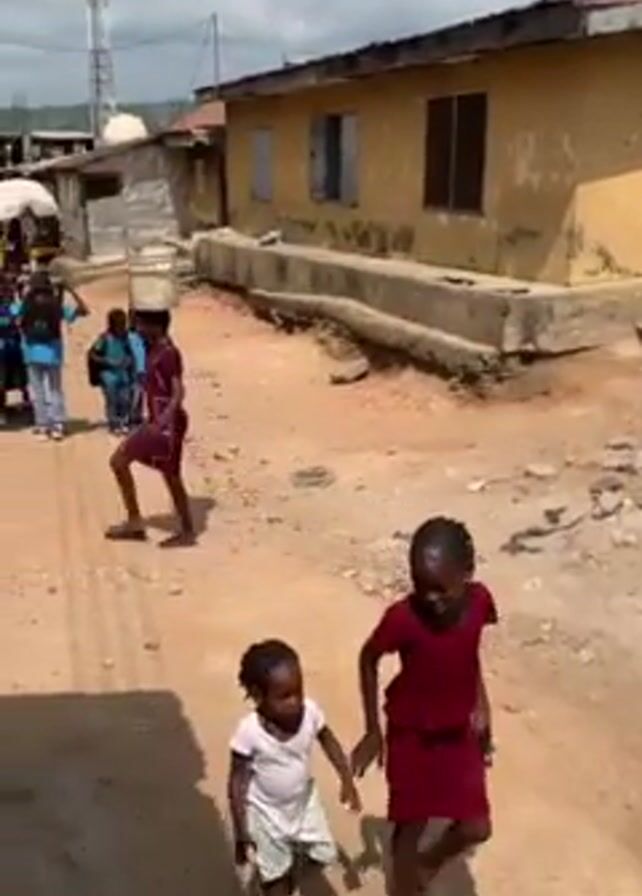 group of children walking along a dirt road in what appears to be a village. Several are carrying items on their heads. The buildings in the background appear modest. The weather looks sunny, with some clouds in the sky. Some of the children are holding hands. There's debris along the side of the road.