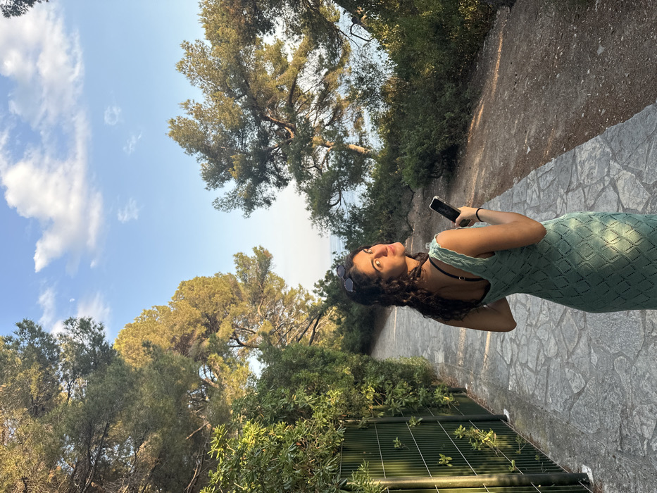A woman in a light green dress stands on a stone path, holding a phone. Behind her is a wrought-iron fence with greenery beyond. The path leads through a wooded area with tall trees on either side. In the distance, a glimpse of the ocean is visible between the trees. The sky is blue with scattered white clouds. Sunglasses rest atop the woman's head.