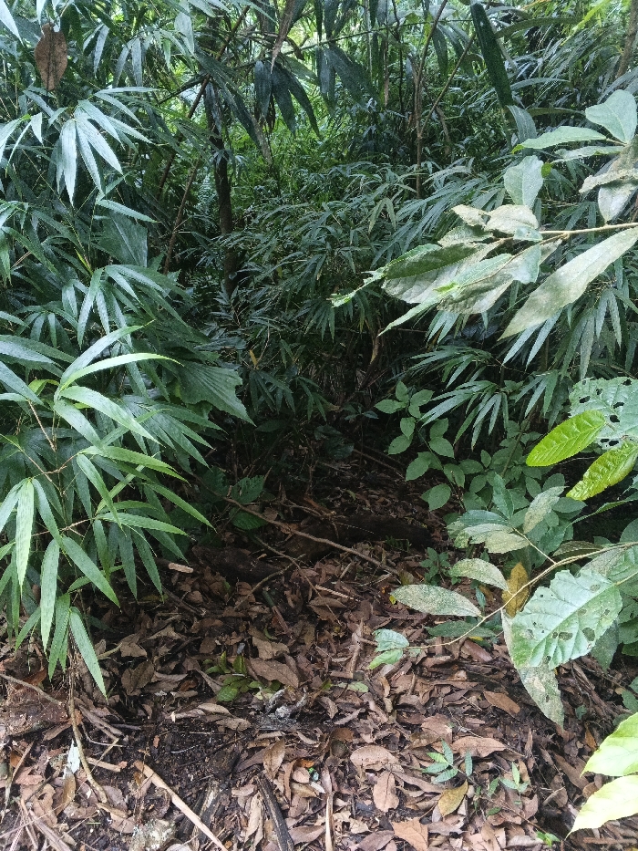 The scene depicts a dense jungle or forest environment in Baglung, Nepal. The foreground consists of a dark brown ground cover composed primarily of dried, fallen leaves, interspersed with exposed soil patches and small twigs. Directly behind this, the area is dominated by an extremely dense array of green vegetation. Prominent are multiple bamboo plants with their characteristic long, slender, pointed green leaves, particularly on the left and central aspects of the frame, extending upwards and deeper into the background. Interspersed with the bamboo are various other broad-leafed plants, some showing signs of minor decay or damage, such as small holes or lighter green mottling. The foliage forms a thick, almost impenetrable barrier, with a very narrow, dark indentation or potential opening visible at the lower center, receding into the dense growth. No individuals, animals, or man-made objects are present. The lighting is ambient, suggesting an overcast day or heavily shaded area.