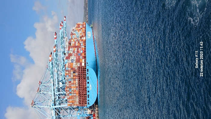 A large, light-blue container ship, identified as a Maersk vessel, is docked at a pier within the Port of Algeciras, Spain. The ship is laden with numerous multi-colored shipping containers stacked high across its visible deck area. Above the ship, several massive light-blue gantry cranes, featuring red and white striped tips on their booms, are positioned over the cargo hold, indicating active loading or unloading operations. A small green tugboat is visible in the water near the stern of the container ship. The foreground consists of deep blue, slightly rippled water. The background reveals a distant, low-lying landmass on the horizon under a clear blue sky with scattered white clouds. No people are discernibly visible. The image was captured on October 22, 2025, at 11:43 AM.
