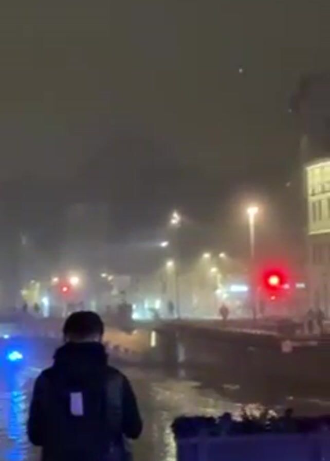 The video opens with a person standing on a bridge at night, looking out over a body of water with illuminated lights. The scene is foggy, with visible traffic and pedestrians in the background. The video shifts focus, panning across a street with active traffic signals. A red emergency vehicle with flashing blue lights approaches a crosswalk in front of a building that resembles a church. The scene is marked by tram tracks embedded in the street.