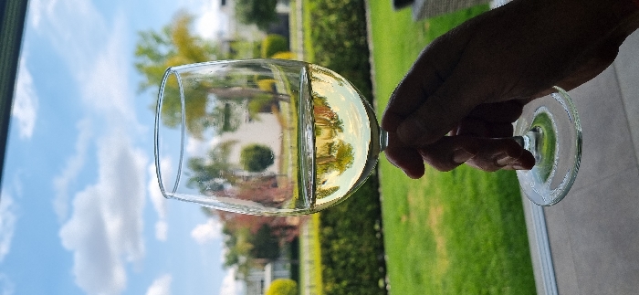 - "A hand holds a glass of white wine in front of a lush green yard and a partially visible house" by FM-rGZrc2, licensed under CC BY 4.0