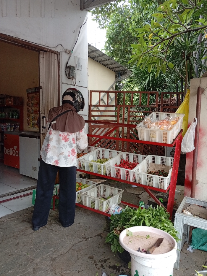 - "A person wearing a helmet and a hijab-like covering is standing in front of a red metal rack with white plastic containers filled with produce like tomatoes, chilies, and other vegetables" by FM-0ickv1, licensed under CC BY 4.0