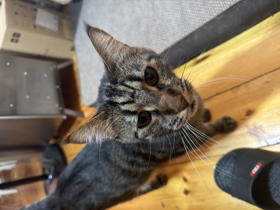 A tabby cat with striking stripes peers upwards, its ears perked attentively. One paw is visible as it sits on a wooden floor next to a black sandal. Above the cat is a gray sofa and some white boxes on a metal stand. The cat's whiskers are long and bright, contrasting against its patterned fur.